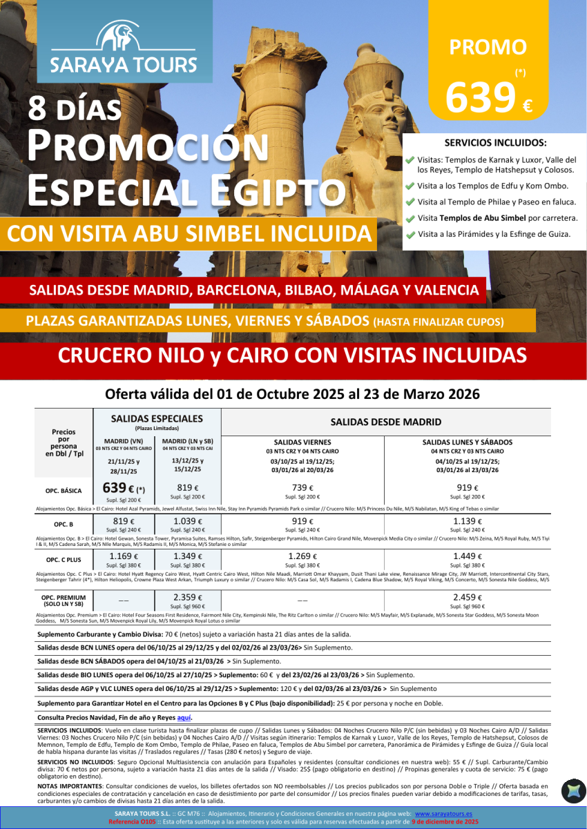 Promo Egipto con Abu Simbel 8días. *Salidas Mad, Bcn, Bio, Agp & Vlc* Crucero y Cairo desde 599 € hasta Sept26