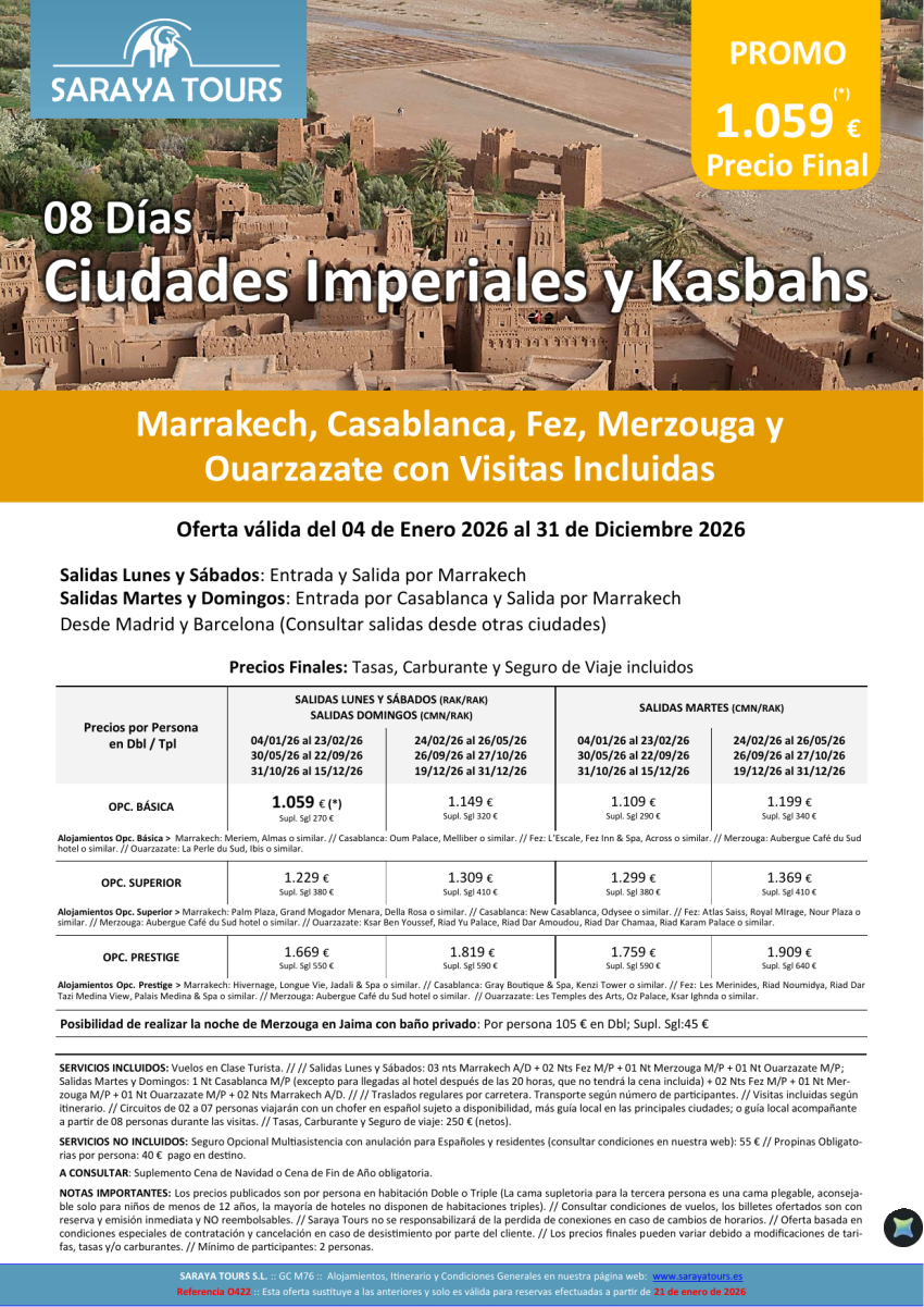 Ciudades Imperiales y Kasbahs 8 días con Visitas Incluidas: Rak, Cmn, Fez, Erfud, Ouarzazate hasta Diciembre26