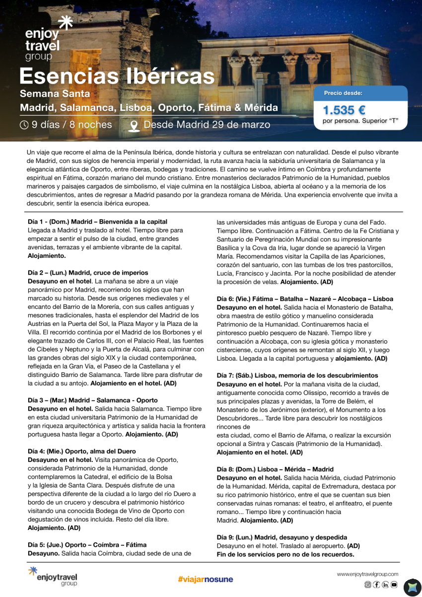 Esencias Ibéricas Semana Santa Madrid, Salamanca, Lisboa, Oporto, Fátima & Mérida desde 1.535€